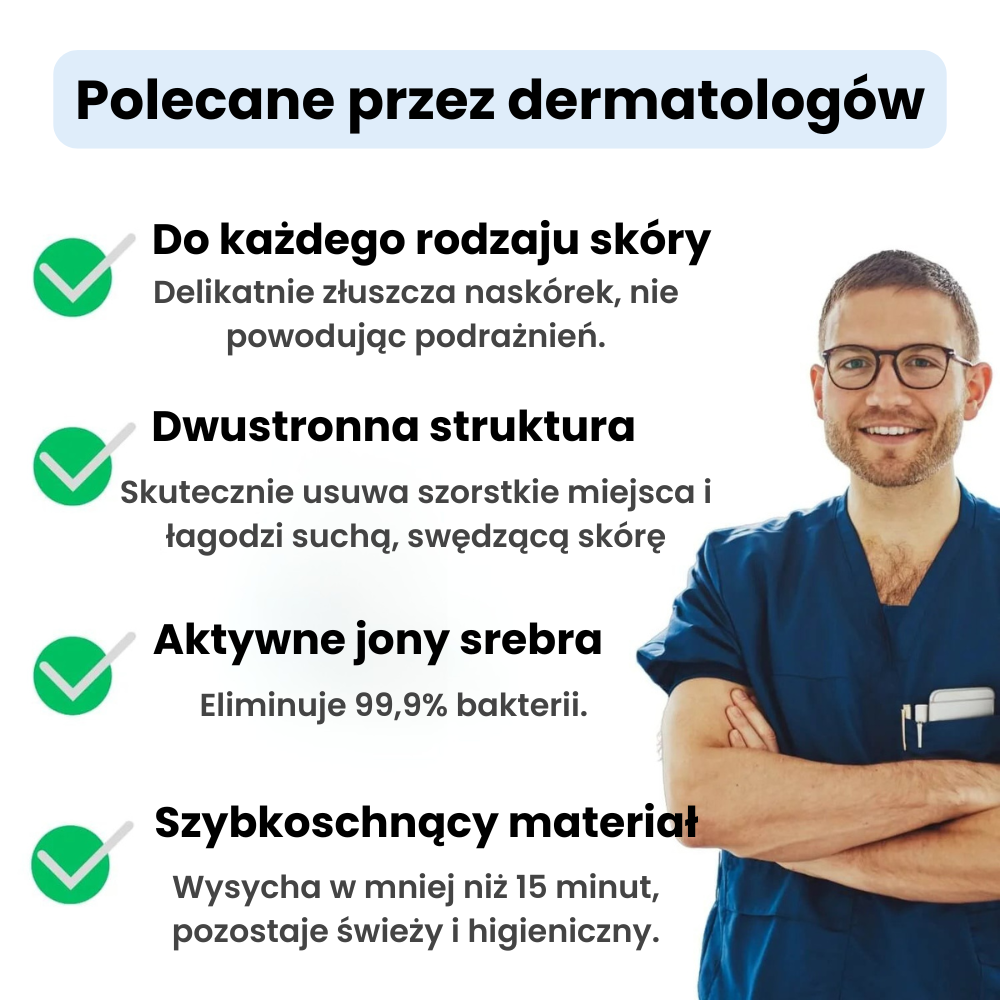 Większość użytkowników zauważa widoczną poprawę po 2–3 tygodniach, stosując ręcznik 2–3 razy w tygodniu. Antybakteryjna technologia pomaga ograniczyć stany zapalne, dzięki czemu skóra poprawia się bez podrażnień.